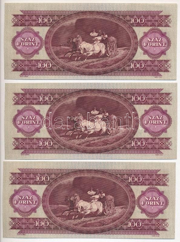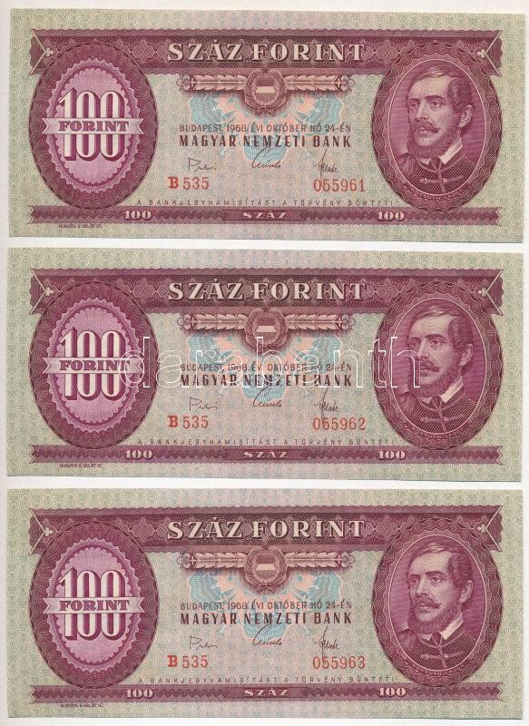 1968. 100Ft (3x) sorszámkövetők T:I,I- https://www.darabanth.com/de/290-Fernauktion/290.0/Numismatik/Ungarische-Banknoten~200007/1968-100Ft-3x-sorszamkovetok-TI-I-~II1531180