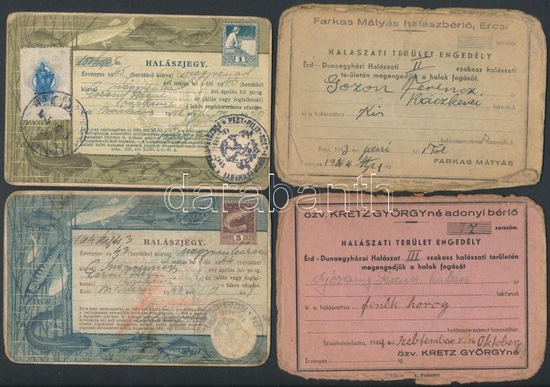 Beschreibung: 1943-1945 2 db halászati terület engedély + 2 db halászjegy okmánybélyeggel