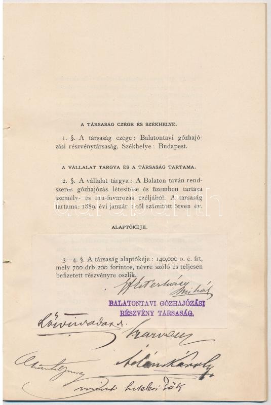 1891 A Balatontavi Gőzhajózási Részvénytársaság Alapszabályai, a társaság tagjainak aláírásával, viaszpecséttel, vezető tisztségviselők aláírásával, törvényszékhez benyújtott példány, 24,5x16 cm