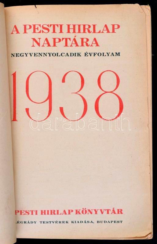 1938 A Pesti Hírlap 1938. évi nagy naptára, kissé viseltes, szakadt pa... https://www.darabanth.com/de/291-Fernauktion/291.0/Andere-Sammelgebiete/Drucksachen~27/1938-A-Pesti-Hirlap-1938-evi-nagy-naptara-kisse-viseltes-szakadt-papirboritoban-de-belul~II1503489