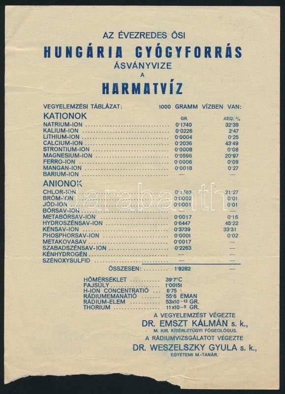 cca 1930 Hungária Gyógyforrás - Harmatvíz, kétoldalas szórólap https://www.darabanth.com/de/291-Fernauktion/291.0/Andere-Sammelgebiete/Drucksachen~27/cca-1930-Hungaria-Gyogyforras--Harmatviz-ketoldalas-szorolap~II1539357