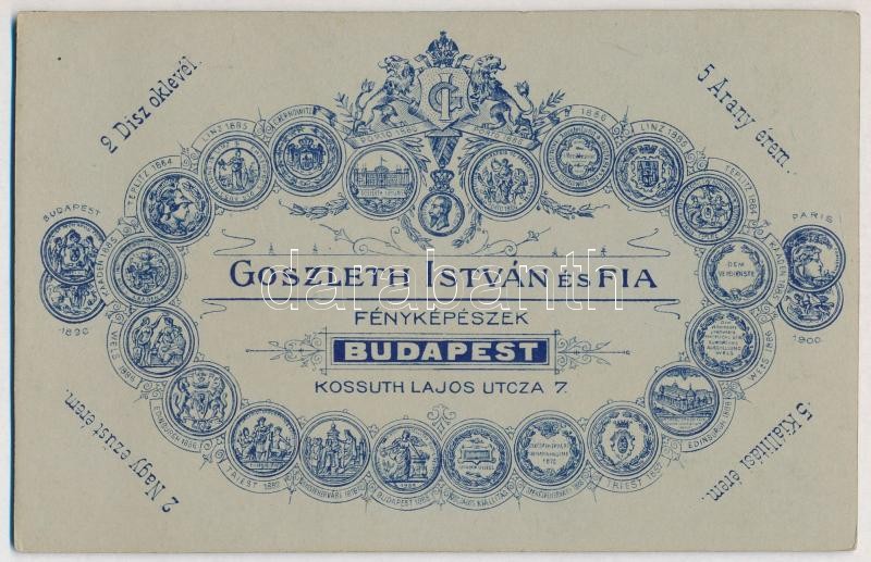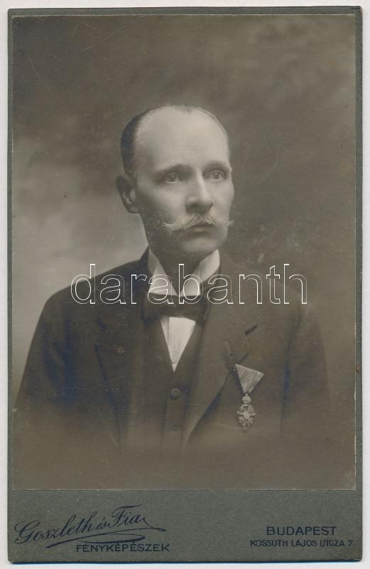 cca 1900 Ferenc József-rend hadidíszítményes lovagkeresztjével kitüntetett férfi portréja, keményhátú fotó Goszleth István budapesti műterméből, 16,5×11,5 cm