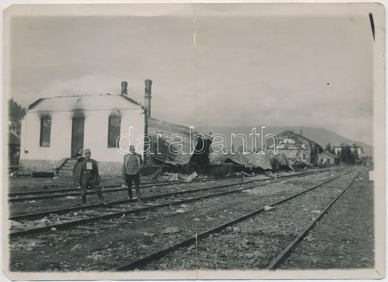 Beschreibung: 1916 Komarnik, tüzérség által megrongált vasútállomás, hátoldalán ragasztott / Komarnik, damaged railway station