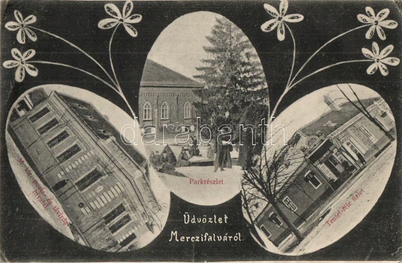 Beschreibung: Mercyfalva, Mercifalva, Carani; M. kir. posta és távirda hivatal, Tenfel üzlete, park / post and telegraph office, shop, park, floral Art Nouveau (EK)
