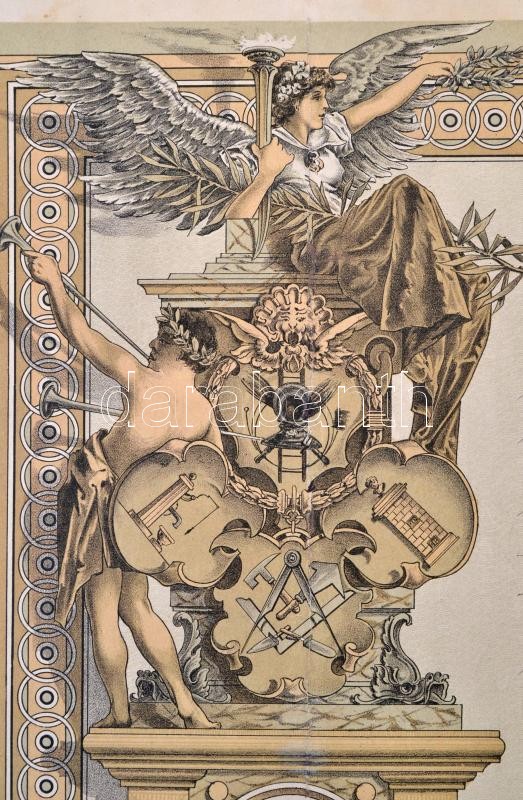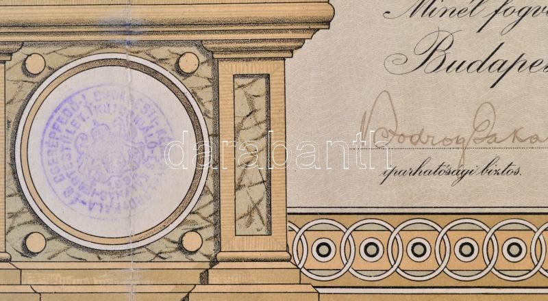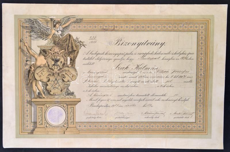 Beschreibung: 1917 Díszesen illusztrált kéményseprő bizonyítvány, Bp., Kéményseprő-, Pala- és Cserépfedő, Kútcsináló és Kályhás Ipartestület, pecséttel, aláírásokkal, 32x50 cm.