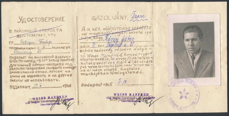 1945 Igazolvány a Weisz Manfréd konzervgyár dolgozója részére, fénykép... https://www.darabanth.com/de/292-Fernauktion/292.0/Andere-Sammelgebiete/Dokument~16/1945-Igazolvany-a-Weisz-Manfred-konzervgyar-dolgozoja-reszere-fenykeppel~II1544978
