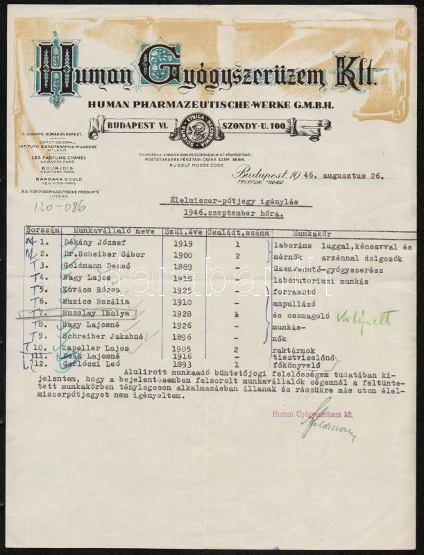 Beschreibung: 1946 Bp., Human Gyógyszerüzem Kft. díszes fejléces számlája