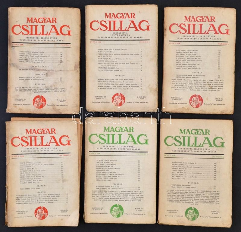 1944 Magyar Csillag. Szerk.: Illyés Gyula. IV. évf. 1-7. szám, 2. szám hiányzik, változó, többnyire viseltes állapotban. Magyar Csillag utolsó évfolyama, a 2. szám kivételével.