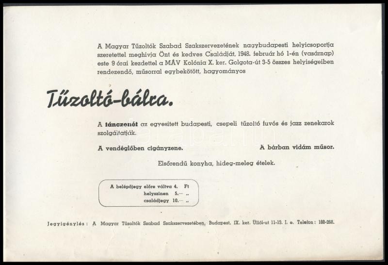Beschreibung: 1948 Meghívó a Magyar Tűzoltók Szabad Szakszervezetének tűzoltó báljára, 13,5x20 cm