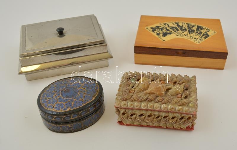 Beschreibung: 1 db art deco alpakka kártya doboz, 15x12x6 cm + 3 db kisebb méretű doboz fából, kagylóval díszített, kb 10x8x4 cm