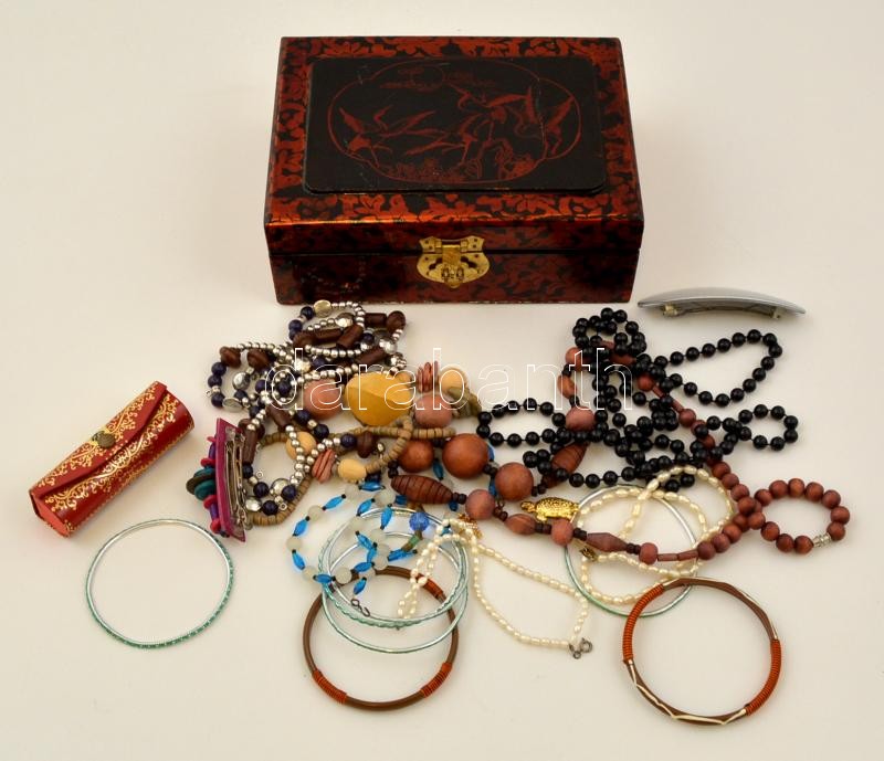 Beschreibung: Kis bizsu tétel: 18 bizsu + 4 db aranyozott bross díszes fa ékszerdobozban