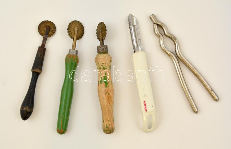 Beschreibung: Kis konyhai eszköz tétel, összesen 5 db: derelyeszaggató, diótörő, hámozó