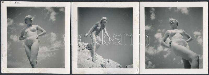 Beschreibung: cca 1938 Dr. Csörgeő Tibor (1896-1968): Szabadtéri akt I-III., 3 db jelzés nélküli vintage fotó a szerző hagyatékából, 6x6 cm