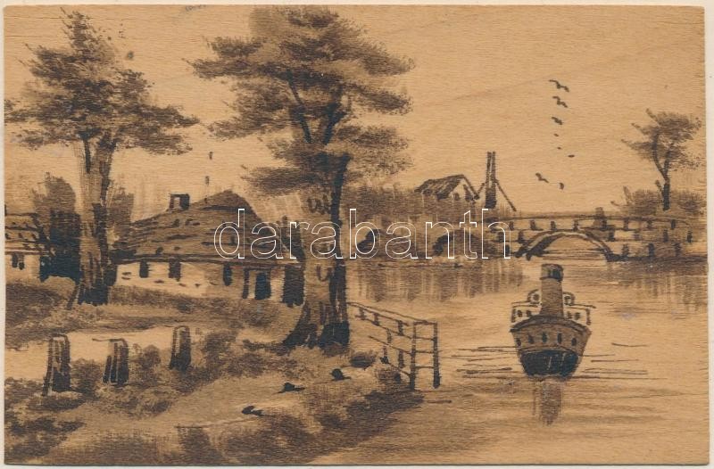 Beschreibung: 1916 Jelzés nélkül: Folyópart, tus, vékony fakéreg, repedt, a hátoldalán ajándékozási sorokkal, 9x13 cm.