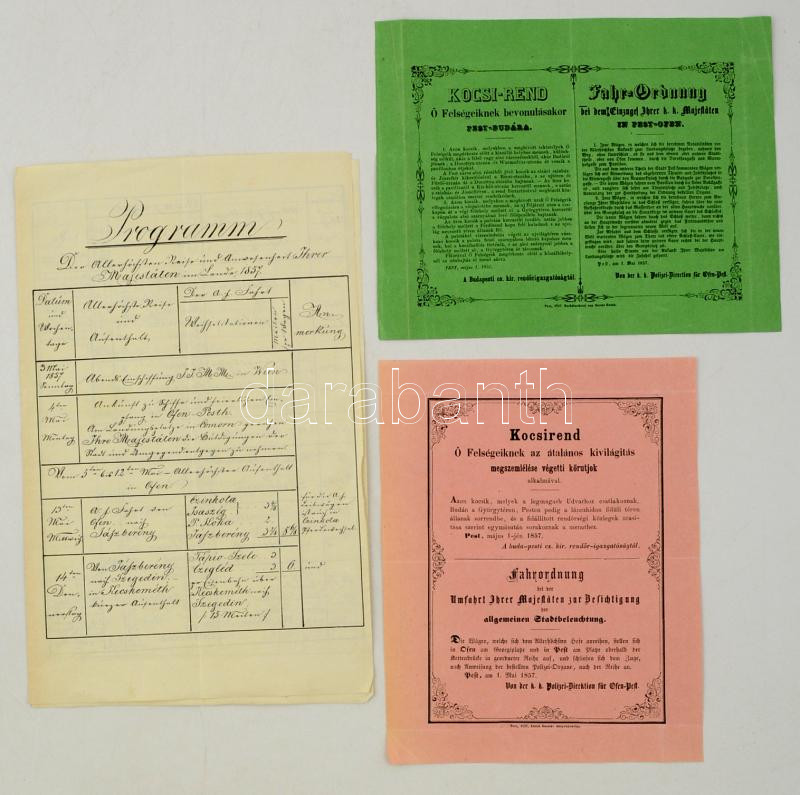 1857 Programm der allerhöchsten Reise und Anwesenheit Ihrer Majestäten, Ferenc József 1857. évi magyarországi látogatásának tervezett (ebben a formában meg nem valósult) időbeosztásának egy példánya, német nyelven, benne két példány kocsirend nyomtatvány 6 p. / a copy of the planned (finally unfulfilled) itinerary of Emperor Franz Joseph to Hungary in 1857, printed in German language, 6 p.