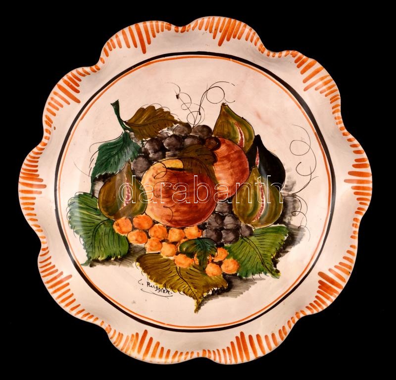 Beschreibung: Kerámia gyümölcstartó, kézzel festett díszítéssel, jelzett, apró lepattanással, d: 30 cm, m: 15 cm