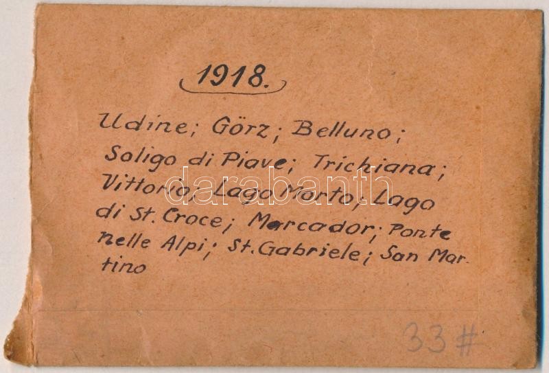 Beschreibung: 1918 Az I. világháborúban szolgálatot teljesítő katona felvételei feliratozott tasakban, 33 db vintage negatív, 4,5x6 cm