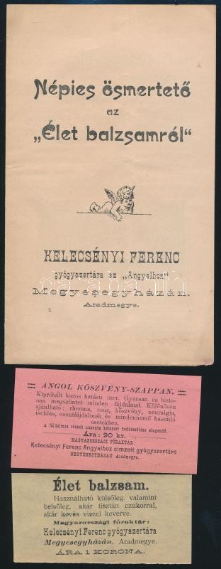 Beschreibung: cca 1900 Medgyesegyháza, Kelecsényi Ferenc gyógyszertárának 3 db termékreklámja: Népies ösmertető az "Élet balzsamról", angol köszvényszappan