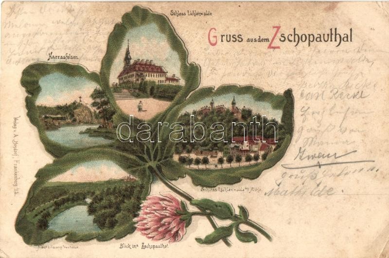 Beschreibung: Zschopautal, Niederwiesa, Harrasfelsen, Schloss Lichtenwalde, Verlag A. Bosdorf / valley, castle, floral Art Nouveau litho (EK)