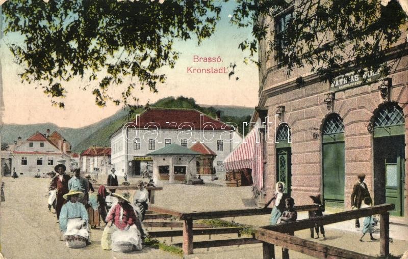 Beschreibung: Brassó, Brasov, Kronstadt; tér, Mathias Wolf és W. Stadlmüller üzlete. + Brief-Stempel Bay. Elsenb. Betr. Kp. Nr. 1. / shops (EK)