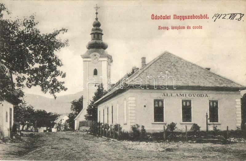 Nagyszabos, Nagyszlabos, Slavosovce; Evangélikus templom és óvoda, utc... https://www.darabanth.com/de/292-Fernauktion/292.0/Ansichtskarten/Slowakei~300007/Nagyszabos-Nagyszlabos-Slavosovce-Evangelikus-templom-es-ovoda-utcakep-church-and-kinderga~II1542617
