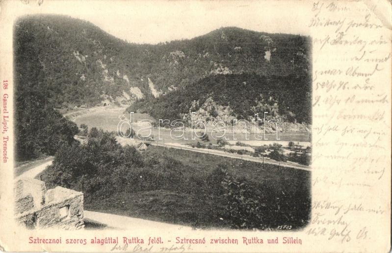 Beschreibung: Sztrecsnói-szoros, Sztrecsény, Strecno; vasúti alagút Ruttka felől. Gansel Lipót kiadása / railway tunnel (kis szakadás / small tear)