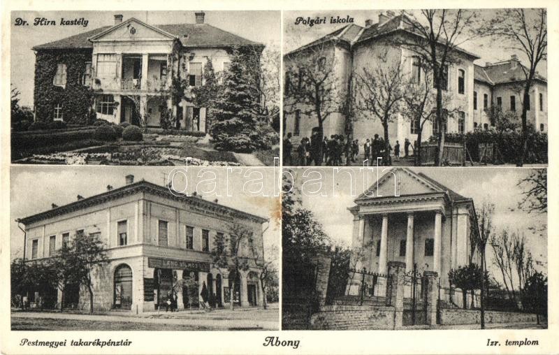 Abony, Dr. Hirn kastélya, Polgári iskola, Pestmegyei takarékpénztár, I... https://www.darabanth.com/de/292-Fernauktion/292.0/Ansichtskarten/Ungarn~300005/Abony-Dr-Hirn-kastelya-Polgari-iskola-Pestmegyei-takarekpenztar-Izraelita-templom-zsinagC3~II1546621