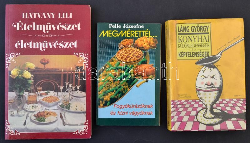 Vegyes gasztronómia könyvek, 5 db: W. Csoma Éva: Ötkarikás szakácskönyv, Hatvany Lili: Ételművészet, életművészet, Pelle Józsefné: Megmérettél..., HVG á la carte. Éttterem és borkalauz. 2003. Szerk.: Gyimesi Zsuzsa, Láng György: Konyhai különlegességek és képtelenségek, Elisabeth Meyer zu Stieghorst: Szárnyasételek. Különféle kiadásban, és kötésben. Változó állapotban, egy részük volt könyvtári példány.