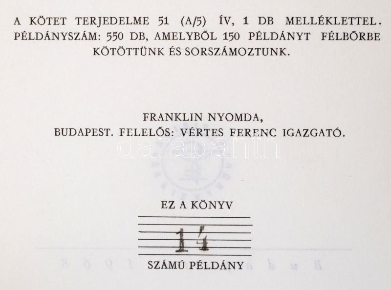Weszprémi István: Magyarország és Erdély orvosainak rövid életrajza III. (Második száz, második rész.) Succincta Medicorum Hungariae et Transilvaniae Biographia. Ovostörténeti Könyvek - Libri Historiae Mediciae. Fordította Kővári Aladár. Budapest, 1968, Medicina. Kiadói félbőr-kötés, festett felső lapélekkel, latin-magyar nyelvű, biligvis kiadás. Számozott (150/14.) példány. Jó állapotban.