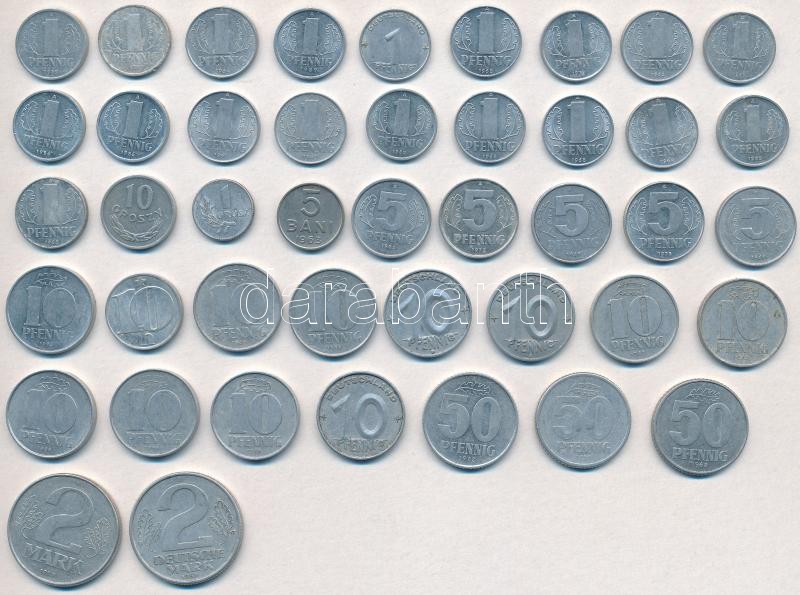 Vegyes: NDK 1953-1989. 1pf Al (19x) + 1968-1983. 5pf Al (5x) + 1949-1985. 10pf Al (11x) + 1958-1972. 50pf Al (3x) + 1957-1975. 2M Al (2x) + Csehszlovákia 1990. 10h Al + Lengyelország 1949. 1gr Al + 1972. 10gr Al + Románia 1963. 5b Al T:2,2-