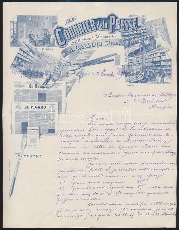 1894 Párizs, Le Courier de la Presse kiadó díszes fejléces levele, francia nyelven, Budapestre küldve, 27,5x21 cm / Paris, decorated letter from a French press to Budapest