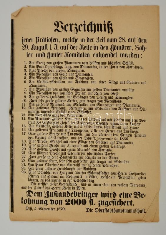 1870 Kétnyelvű rendőrségi körözvény plakát. 60x30 cm https://www.darabanth.com/de/293-Fernauktion/293.0/Andere-Sammelgebiete/Drucksachen~200041/1870-Ketnyelvu-rendorsegi-korozveny-plakat-60x30-cm~II1555567