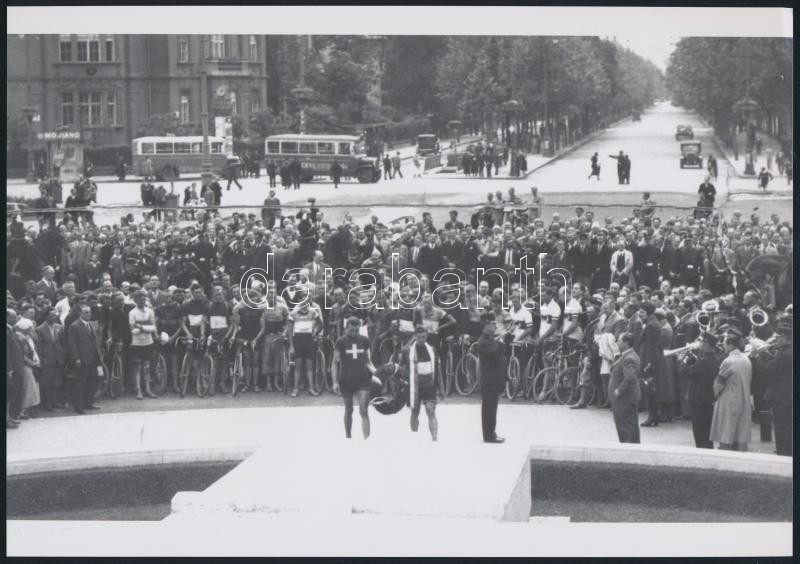 cca 1925 Budapest, Hősök tere, kerékpárosok, autóbuszok, automobilok, Fekete György (1904-1990) budapesti fényképész hagyatékában fellelt repró negatív mai nagyítása, 18x25 cm