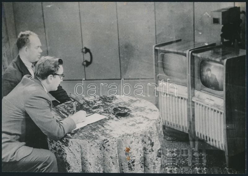 cca 1960 Moszkva, Leningrád és Kijev között létesült videotelefon vonal, két képernyős, külön a bejövő és a kimenő képeknek, felettük látható a kamera, 16x23 cm