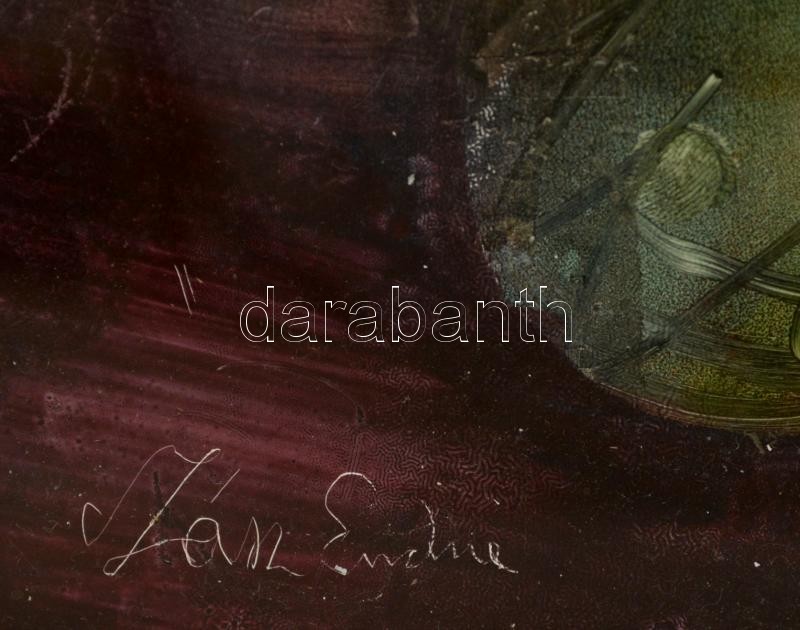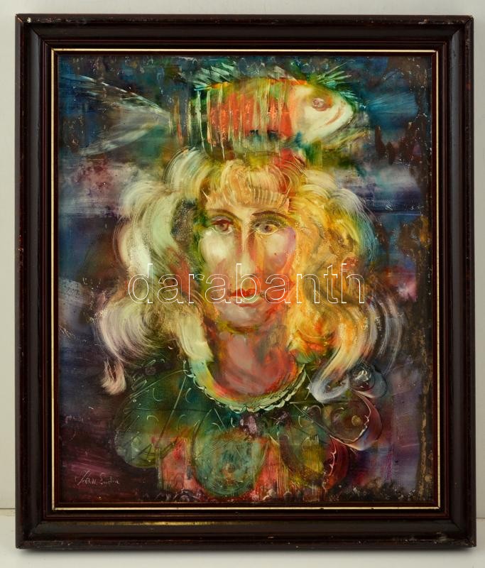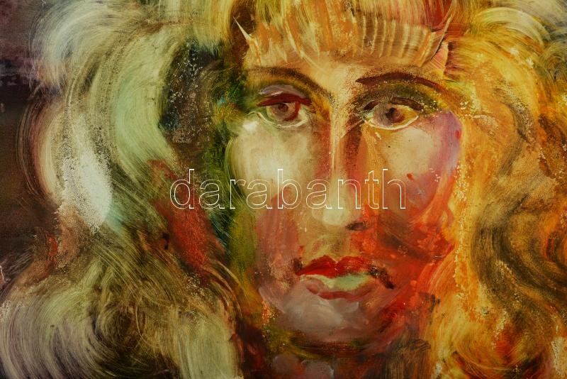 Beschreibung: Szász jelzéssel: Női fej hallal. Olaj, fémlemez, keretben, 45×37 cm