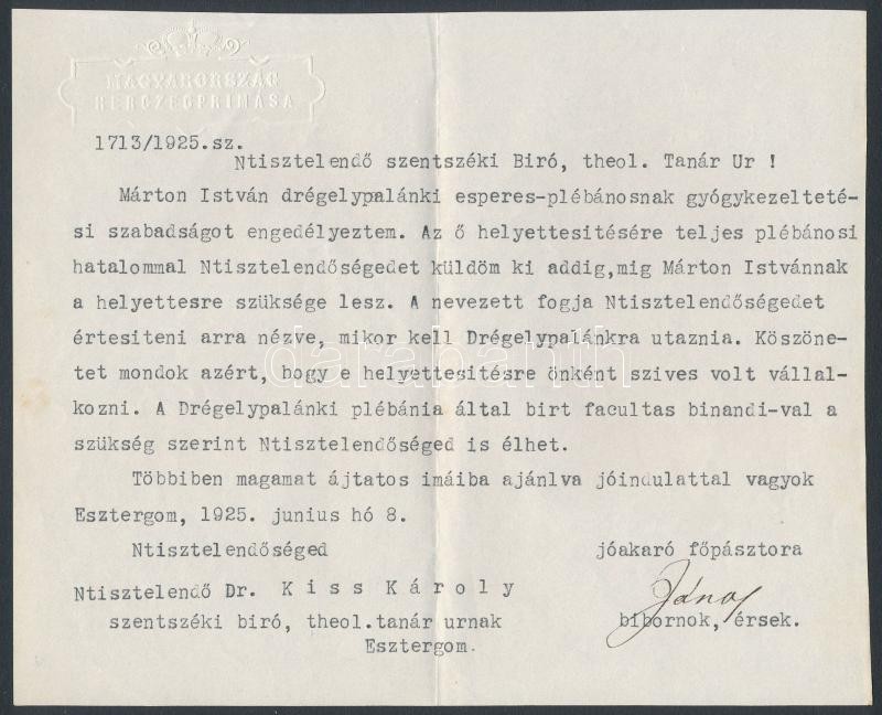 1925 Esztergom, Csernoch János(1852-1927) bíboros saját kézzel aláírt levele dr. Kiss Károly teológia tanár részére, melyben felkéri a beteg drégelypalánki plébános helyettesítésére