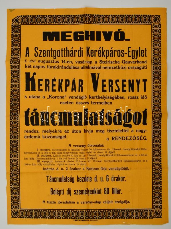 cca 1930 Kerékpárverseny plakátja. Szentgotthárd. 50x70 cm https://www.darabanth.com/de/293-Fernauktion/293.0/Andere-Sammelgebiete/Poster~200029/cca-1930-Kerekparverseny-plakatja-Szentgotthard-50x70-cm~II1555562