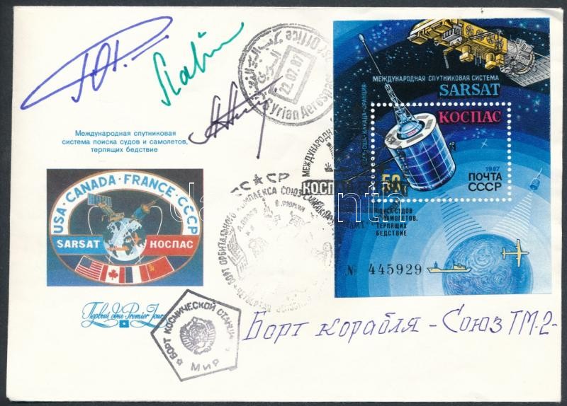 Jurij Romanyenko (1944- ), Alekszandr Lavejkin (1951- ) szovjet és Alekszandr Alekszandrov (1951- ) bolgár űrhajósok aláírásai SARSAT-KOSPAS emlékborítékon /
