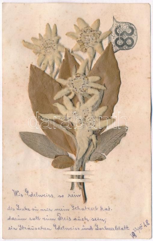 Beschreibung: Havasi Gyopár élővirágos képeslap. Cs. és Kir. 38. gyalogezred özvegy és árvaalapja / Leontopodium alpinum real flower, military charity card (fl)