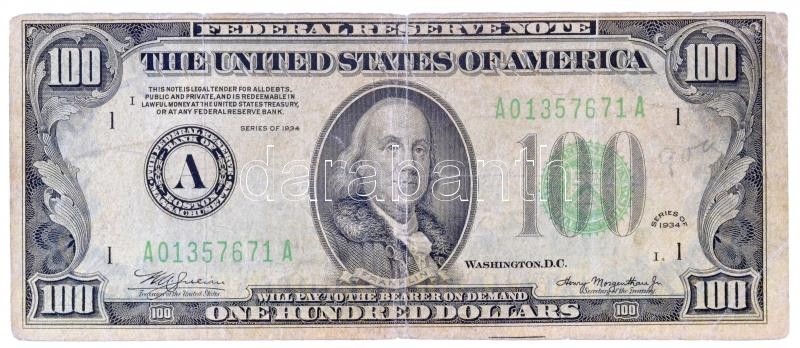 Amerikai Egyesült Államok / Boston 1934-1945. (1934) 100$ "Federal Reserve Note" sötétzöld pecsét, "William Alexander Julian - Henry Morgenthau Jr." T:III,III-