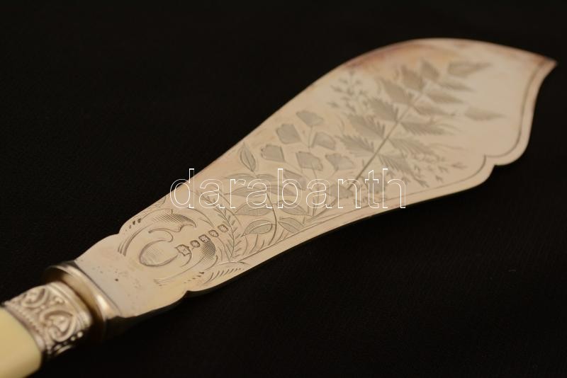 Beschreibung: Dekoratív süteményes készlet. Aranyozott alpakka, csont nyéllel, díszdobozban / Vintage tarte set, 36x11 cm