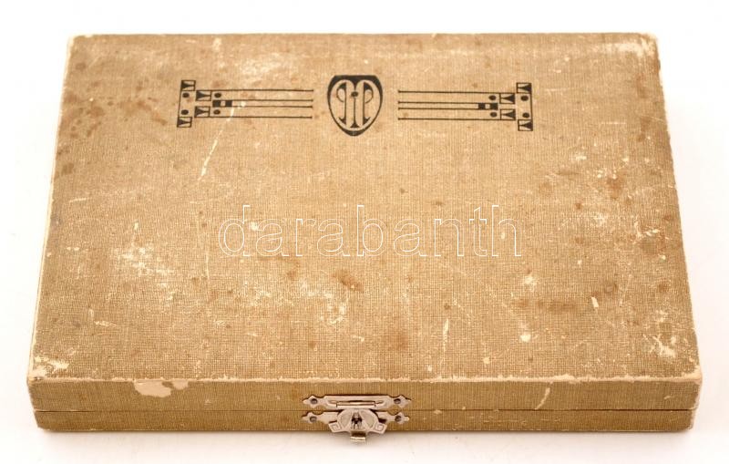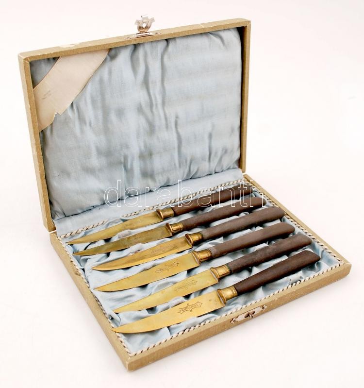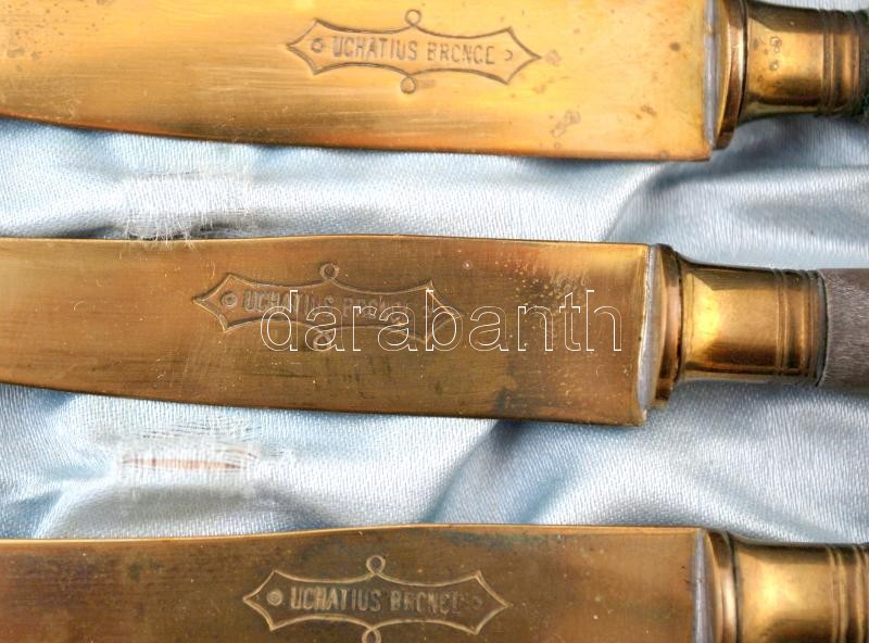 XX. sz eleje: Uchatius rózsafa nyelű vajazó kés készlet. Acél és bronz. Eredeti dobozában / Begining of the 20th century: Knife set in original box. Rose-wood handle, bronze-steel blade 18 cm