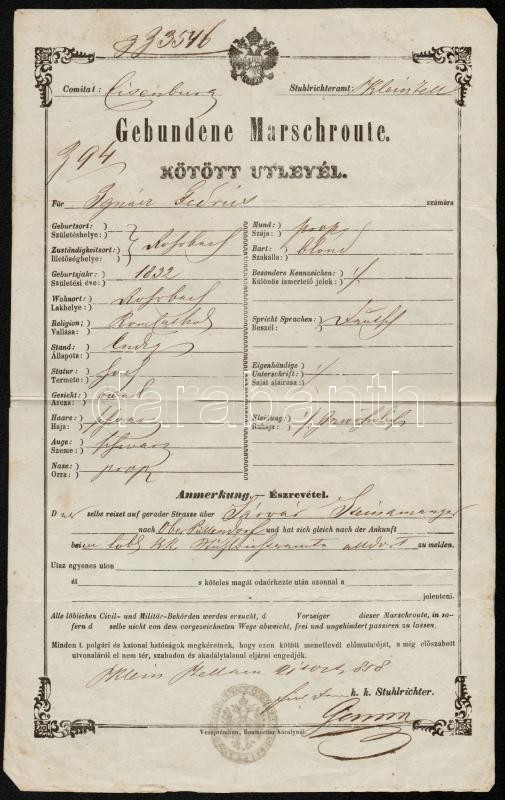 Beschreibung: 1858 Kötött útlevél települések pecsétjével / 1850 Bound route passport