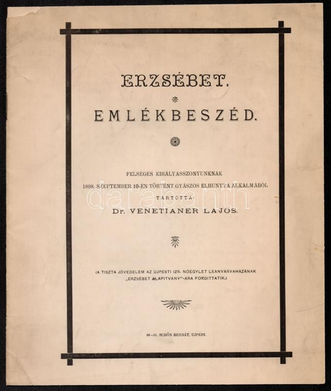 1898 Erzsébet emlékbeszéd. Felséges királyasszonyunknak 1898. szeptember 10-én történt gyászos elhunyta alkalmából tartotta dr. Venetianer Lajos. Ujpest, 1989. Schön Bernát. Kiadja az Ujpesti Izraelita nőegylet. 10p. 22x27 cm