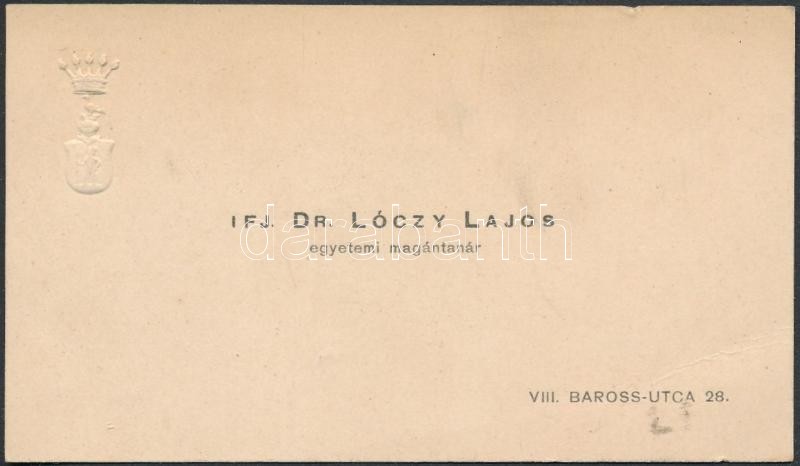 cca 1920-1930 Ifj. Lóczy Lajos (1891-1980) geológus dombornyomott névj... https://www.darabanth.com/de/294-Fernauktion/294.0/Andere-Sammelgebiete/Drucksachen~200027/cca-1920-1930-Ifj-Loczy-Lajos-1891-1980-geologus-dombornyomott-nevjegye~II1559740