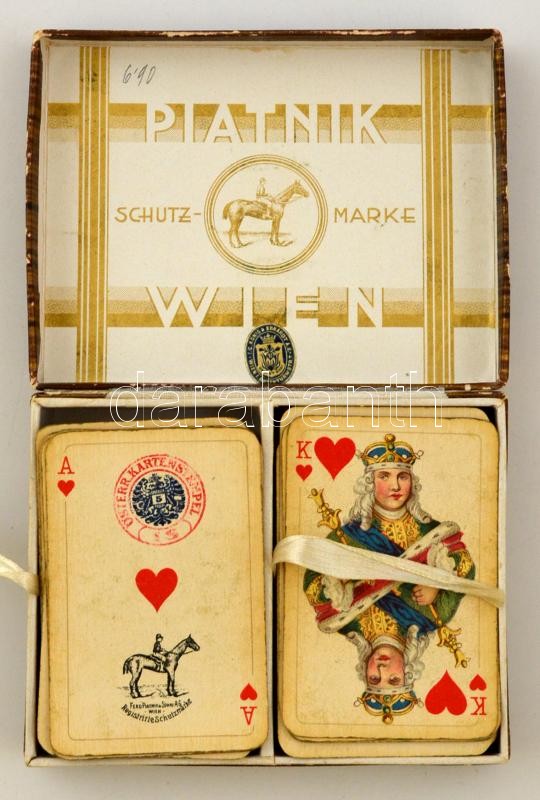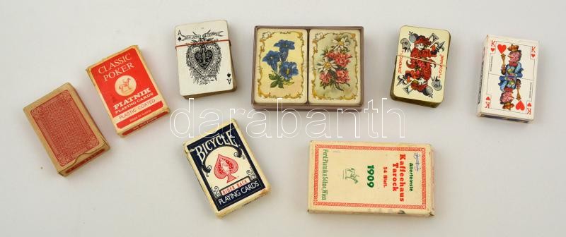 11 pakli kártya(közte 7 Piatnik), benne kávéházi tarokk, 2 pakli adóbélyeggel, belga és USA gyártmány, egy Papyrolux jelzéssel, a legtöbb szép állapotban