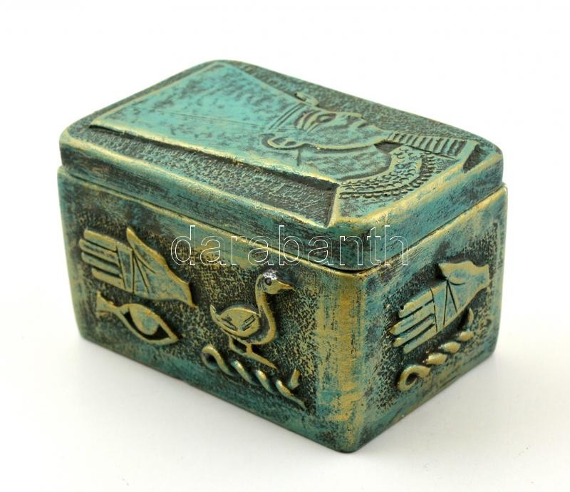 Beschreibung: Festett egyiptomi gipsz dobozka, apró lepattanással, 11×7 cm