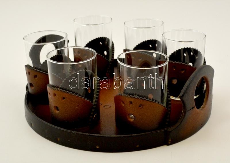 Beschreibung: Retró bőr borospohár-tartó szett pohárral (6 db), d: 5,5 cm + bőr kínáló tálca, d: 24,5 cm