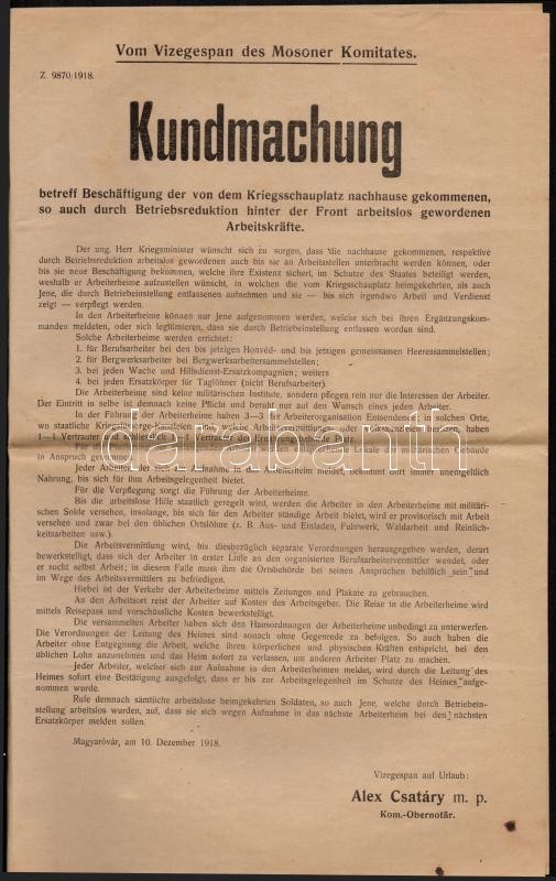 Beschreibung: 1918 Hirdetmény a leszerelés után hazatérő katonák foglalkoztatásáról 53x41 cm