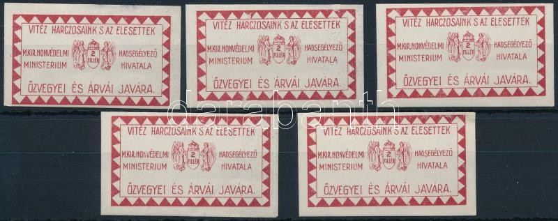Beschreibung: 1914-1919. 5 db 2f "M. Kir. Honvédelmi Minisztérium Hadsegélyező Hivatala", "Özvegyei és Árvái Javára"